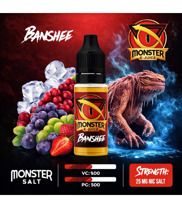 Monster Banshee Salt Likit 10ml, üç farklı üzüm aroması, çilek ve buz serinliğinin birleştiği ferahlatıcı bir salt likit olup 50VG/50PG oranı ve 25mg nikotin seviyesi ile pod sistem elektronik sigara cihazlarında yoğun aroma ve pürüzsüz içim deneyimi sunar.